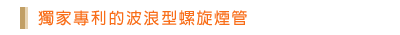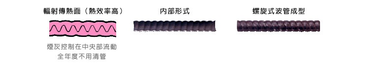 獨家採用波浪型螺旋煙管,比一般平直管可增加1.6倍之熱傳導率。 且因螺旋式之輸送作用,使煙灰於管中心流動,而不易附著管壁, 可減輕清管維護時間及次數,保持高效率。(參考下圖)